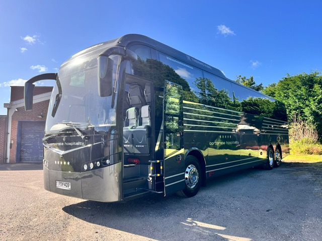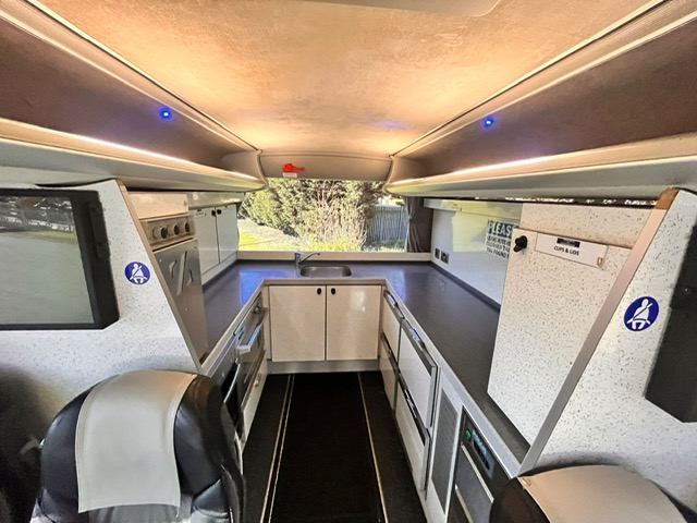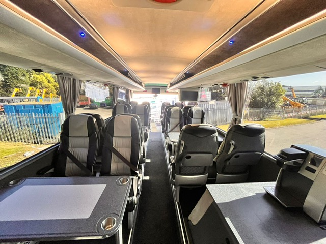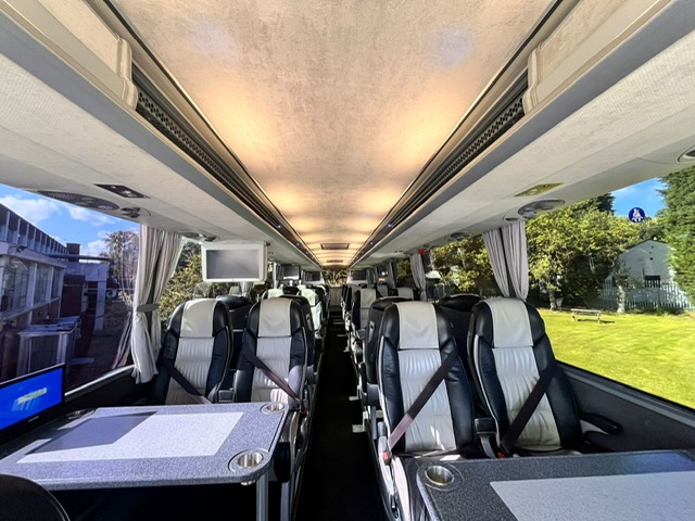 36 Seat Corporate coach. 36 high back leather seats around tables, Air Conditioned, Monitors, Catering including fridges, cookers, microwaves, drinks, ice maker, 240v power at all seats, Wi-Fi, team specification so also benefits from a physio table at the rear and large luggage capacity. Ideal for that corporate day out.