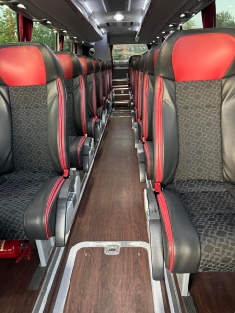 Euro 6, 34 Seat executive coach. 3 point seat belts, reclining seats, A/C, DVD player, luggage capacity, Toilet.
